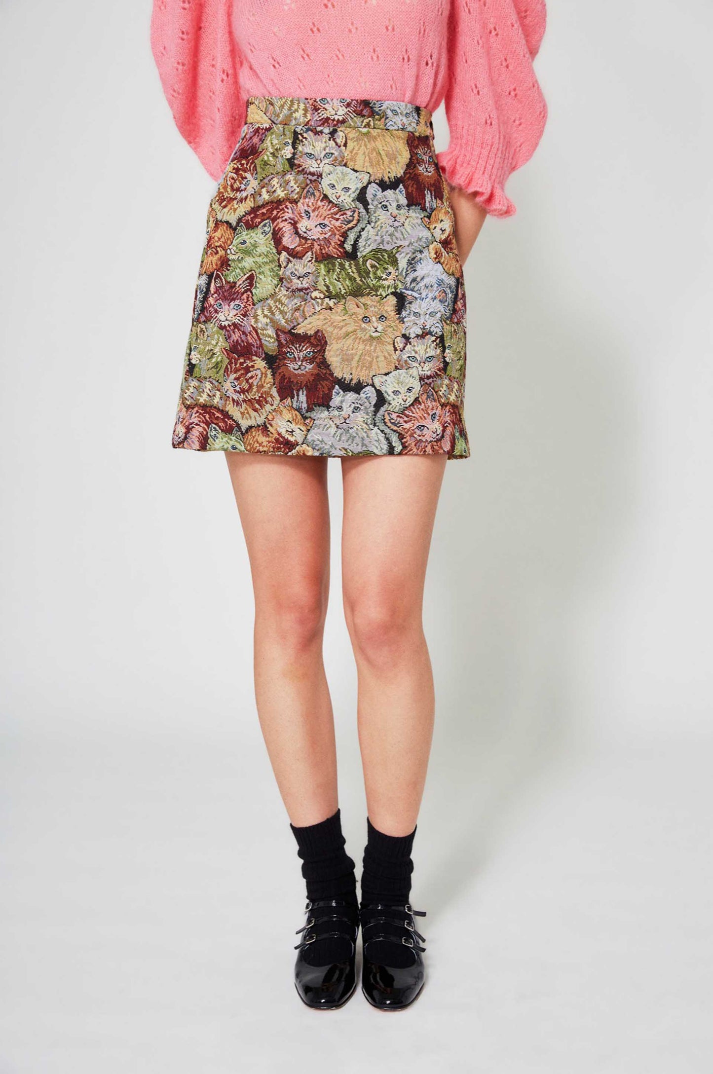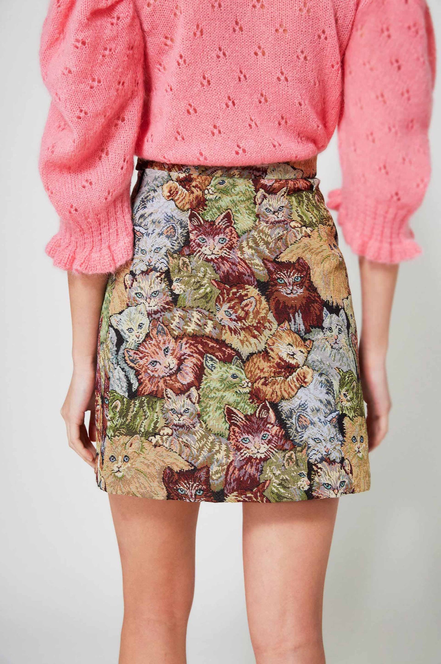 Mini-jupe en jacquard à imprimé chats en laine mélangée. Taille haute. Fermeture avec un zip latéral et un bouton.
